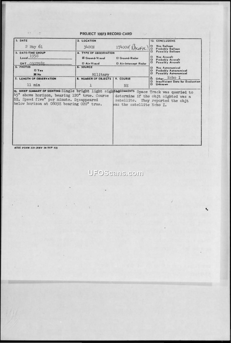 A military report of a bright light observed in the Pacific on May 2, 1961, which was subsequently identified by Space Track as the satellite Echo I.