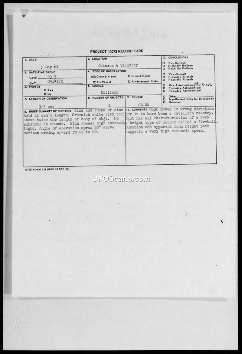 Multiple military personnel in Okinawa observed a greenish-white fireball on May 5, 1961. Intelligence investigation concluded the object was a meteor.
