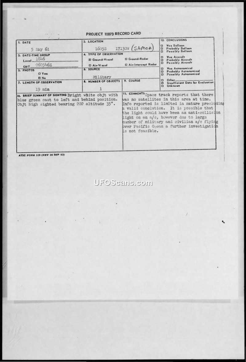 On May 5, 1961, at 1846 local time, the crew of the SS VENTURA reported a sighting of an unidentified aerial object in the vicinity of Samoa (1605S 17130W). The object was described as a bright white light with a blue-green cast, observed at a bearing of 202 degrees and an altitude of 35 degrees. The observation lasted for approximately 19 minutes. The report was transmitted via military communication channels to various commands, including HQUSAF and CINCPAC. Project 10073 records indicate that 'Space track' was consulted and confirmed that no satellites were present in the area at the time of the sighting. The official assessment concluded that while the object might have been an anti-collision light from an aircraft, the high volume of military and civilian air traffic over the Pacific Ocean made a definitive identification or further investigation unfeasible. The case was ultimately closed with the determination that the information provided was too limited to reach a valid conclusion.