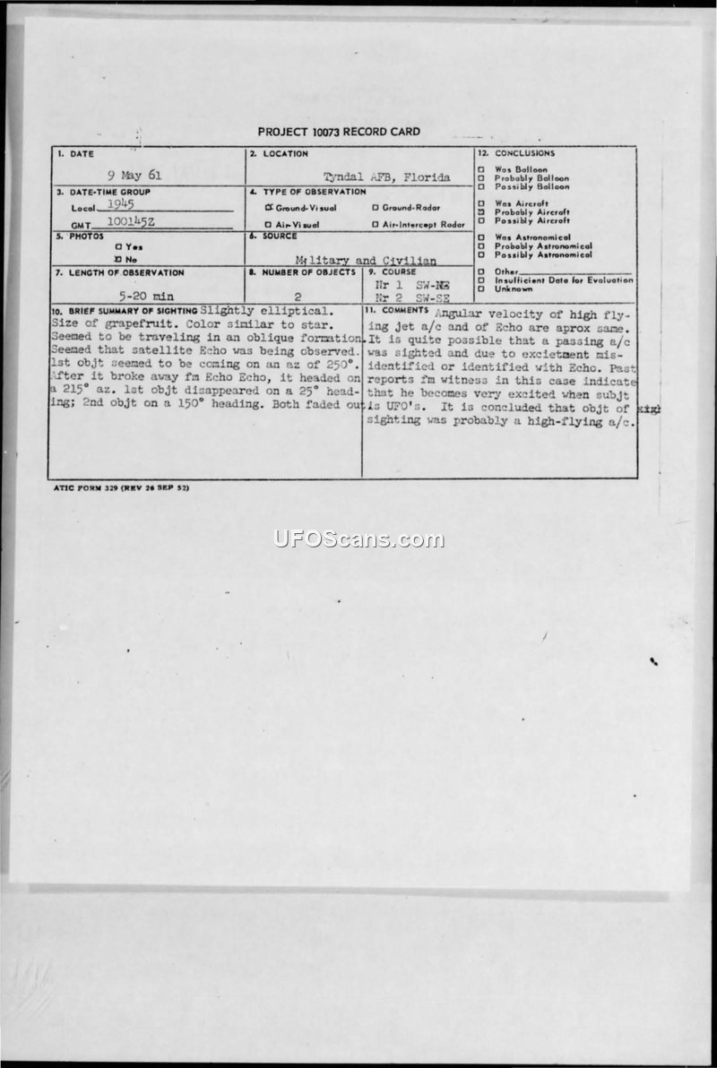 Report on Unidentified Flying Object (UFO) — Tyndall AFB, 9 May 1961