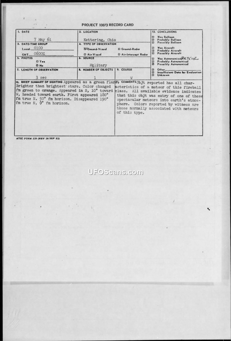 Project 10073 Record Card — Kettering, Ohio, 7 May 1961