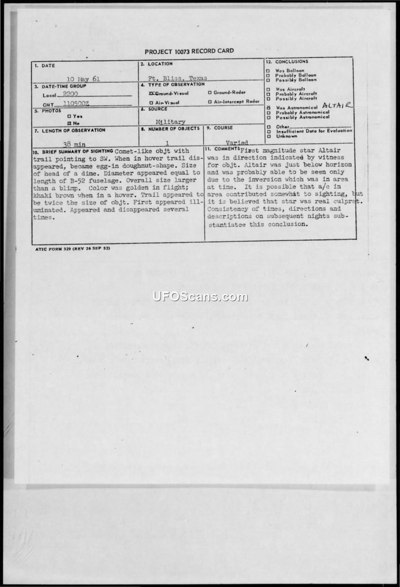 A military report from 1961 documents a UFO sighting at Ft. Bliss, Texas, which was officially identified by the Air Technical Intelligence Center as the star Altair.