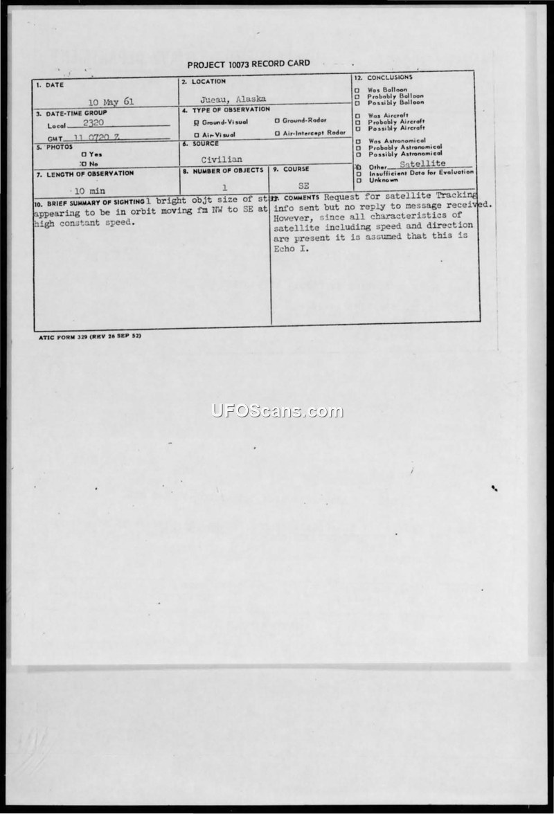 A civilian marine surveyor reported a bright, star-like object moving in orbit over Juneau, Alaska, on May 10, 1961. The object was officially identified by ATIC as the Echo I satellite.