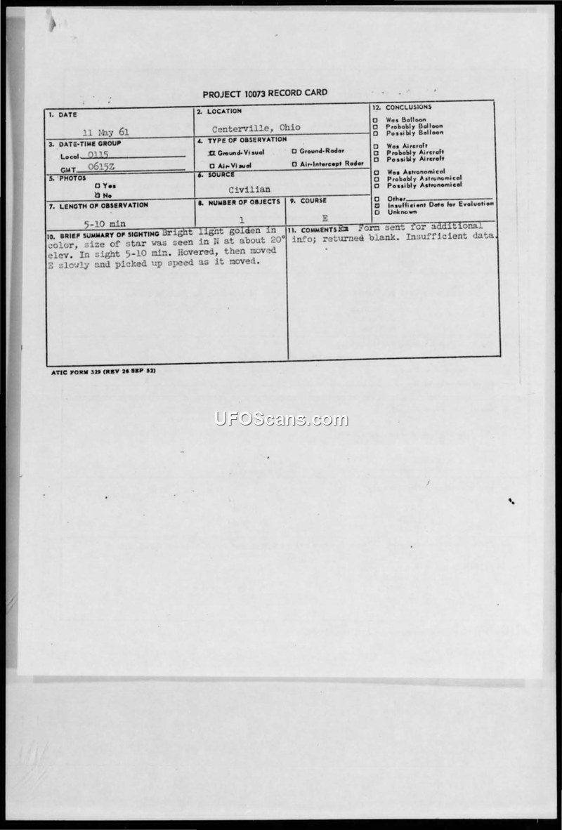 Project 10073 Record Card — Centerville, Ohio, 11 May 1961