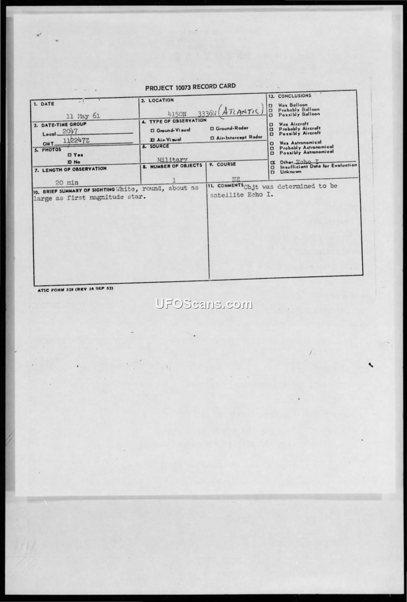 Project 10073 Record Card — Sighting of Satellite Echo I, 11 May 1961