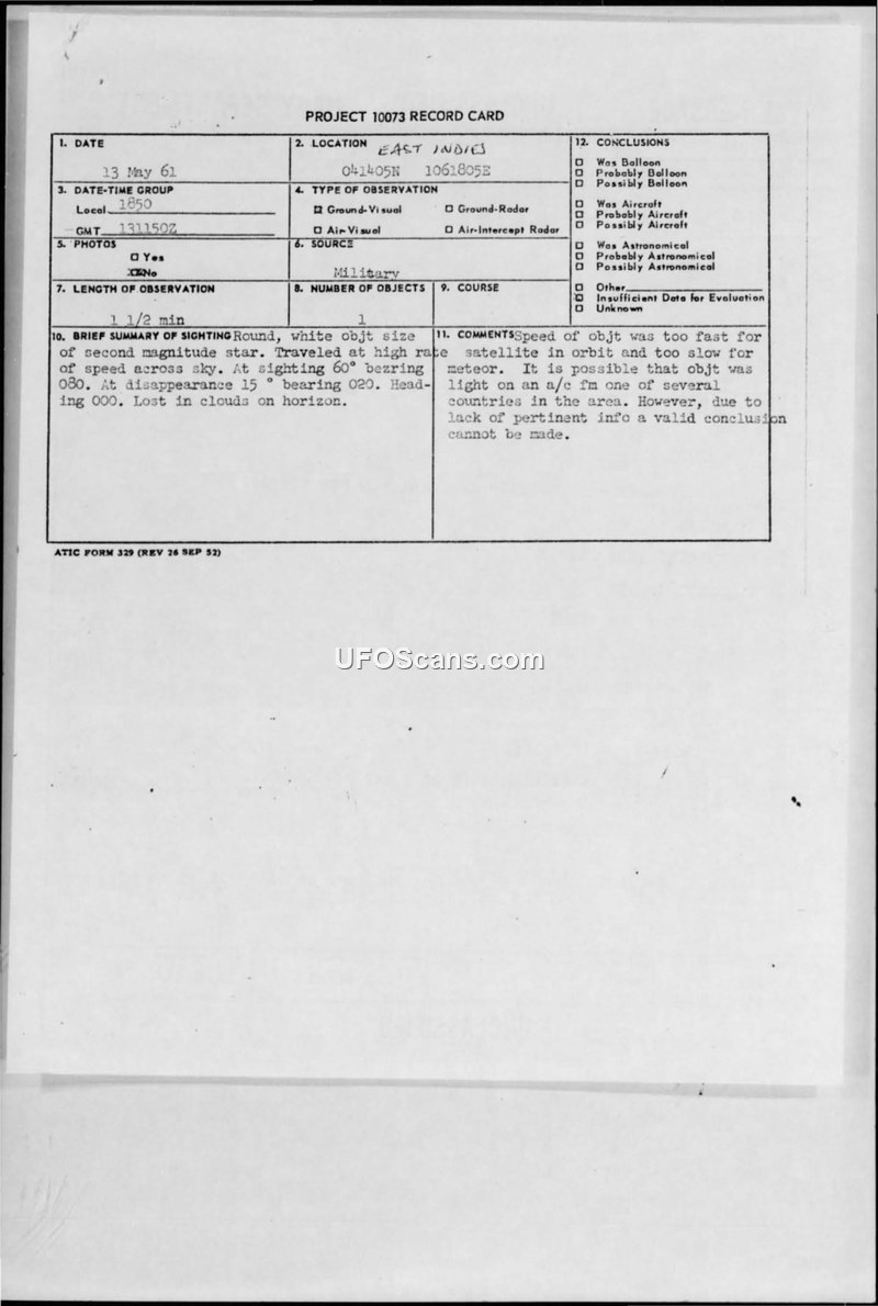On May 13, 1961, at 1850 local time, a group of reliable military personnel aboard the USS Saint Paul observed an unidentified aerial object in the East Indies region at coordinates 04-14.5N 106-18.5E. The witnesses included LCOL P.E. Dunlap (USAF), LCDR GA Murphy (USN), LT R. Karger (USNR), LT G E King (USN), and LT NHS Walczak (USN). The object was described as round, white, and approximately the size of a second-magnitude star. It was observed for one and a half minutes, traveling at a high rate of speed across the sky on a heading of 000 degrees, before being lost in clouds on the horizon. The observers noted that the object performed no maneuvers. The sighting was reported via naval message to Clark Air Force Base and subsequently processed under Project 10073. The official assessment noted that the object's speed was too fast for a satellite in orbit but too slow for a meteor. While it was suggested that the object might have been a light on an aircraft from one of the countries in the area, the final conclusion remained that there was insufficient information to make a valid determination.