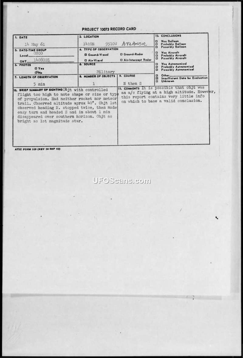Project 10073 Record Card — Sighting Incident 14 May 1961