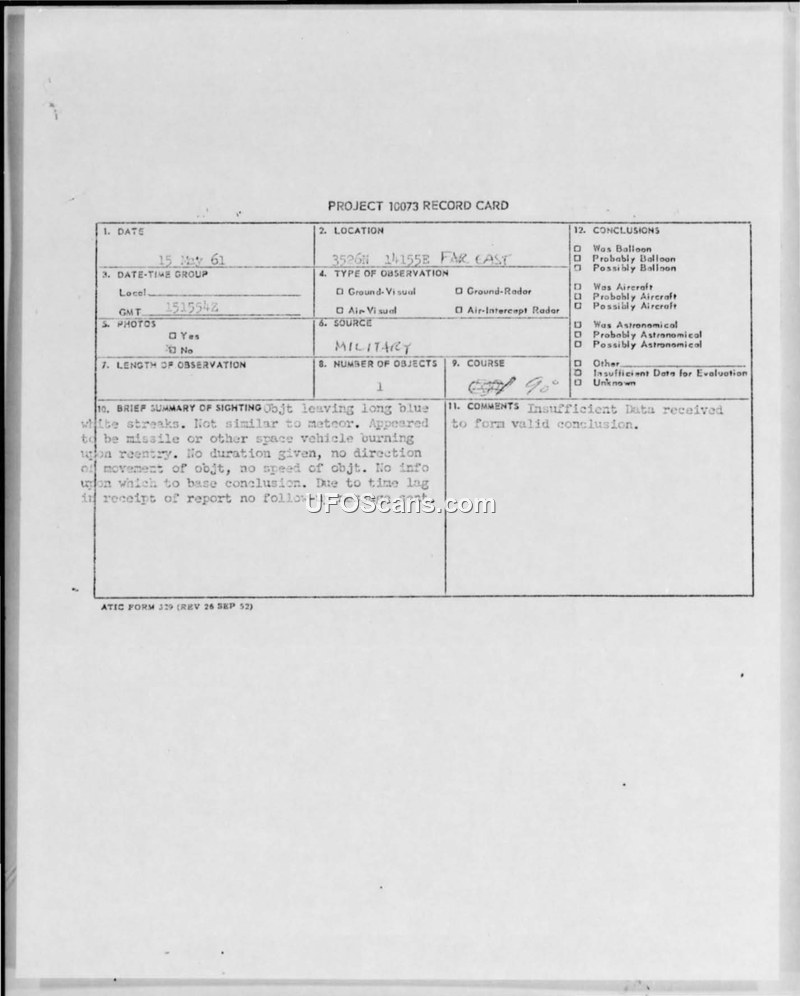 Project 10073 Record Card — Sighting Report 15 May 1961