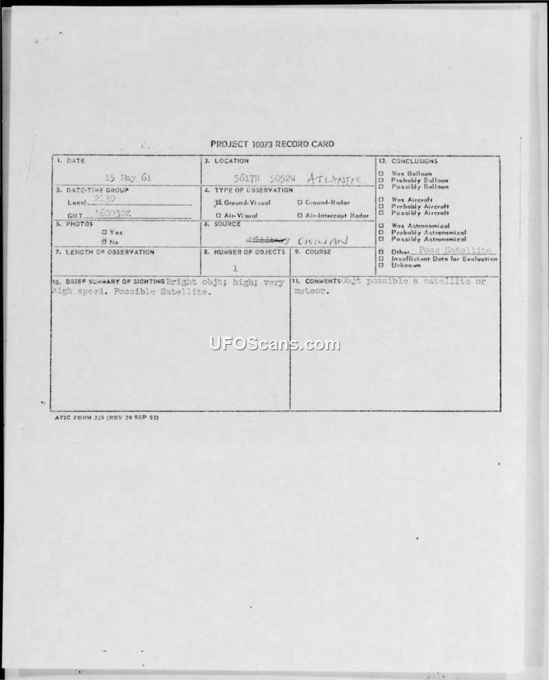 A Project 10073 record card documenting a high-speed, high-altitude sighting in the Atlantic on May 15, 1961. The object was officially classified as a possible satellite or meteor.