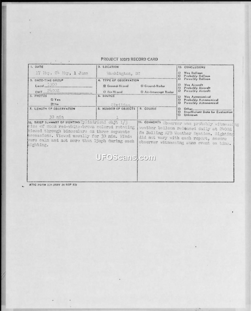 This document consists of a Project 10073 record card and an associated 'Operational Immediate' military cable regarding a series of sightings reported in Washington, D.C. A civilian witness reported observing a cylindrical object on three separate occasions: May 17, May 24, and June 1, 1961. The object was described as being one-third the size of a full moon, featuring white, red, and brown horizontal bands. The witness observed the object rotating counter-clockwise through 7x50 binoculars for approximately 30 minutes each time. The object was consistently reported at an altitude of 40 degrees above the horizon. The military investigation, led by Major Johnnie J. Holland, concluded that the sightings were likely the result of a weather balloon released daily from the Bolling Air Force Base weather station at 2400Z. The report notes that the sighting details remained consistent across all three reports, leading investigators to assume the observer was witnessing the same event repeatedly. The document includes detailed meteorological data for the dates in question and confirms that no radar contact was made during the sightings.