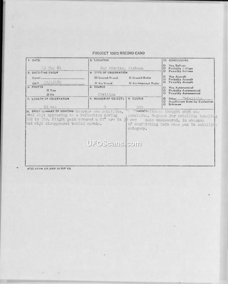 PROJECT 10073 RECORD CARD — Bay Minette, Alabama, 19 May 1961