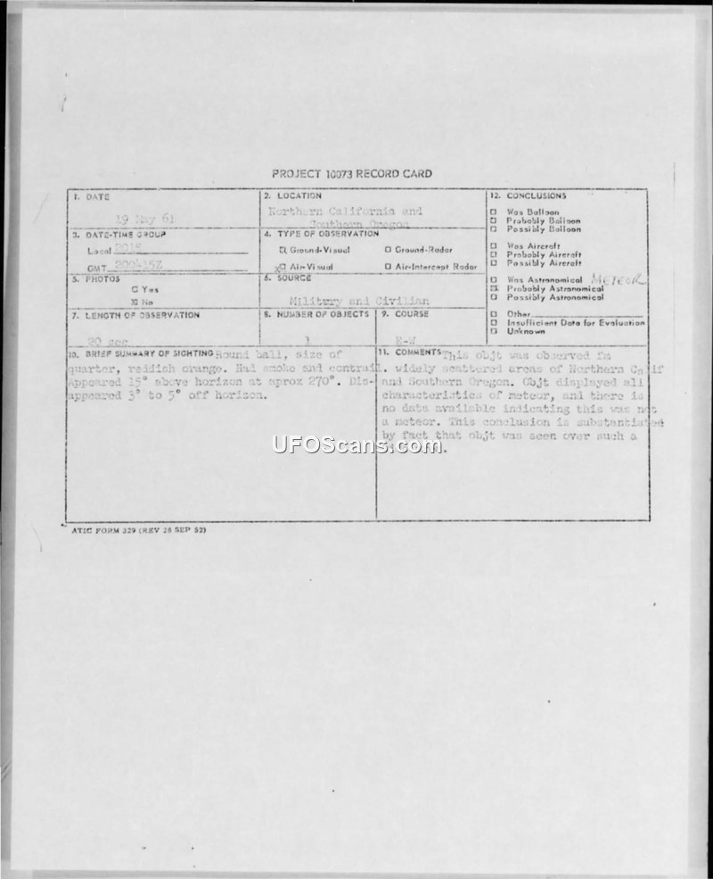A May 1961 sighting of a reddish-orange object with a contrail over Northern California and Oregon was officially classified by the Air Force as a meteor. The report includes witness accounts from military aircrews and confirms the object was observed over a wide geographic area.