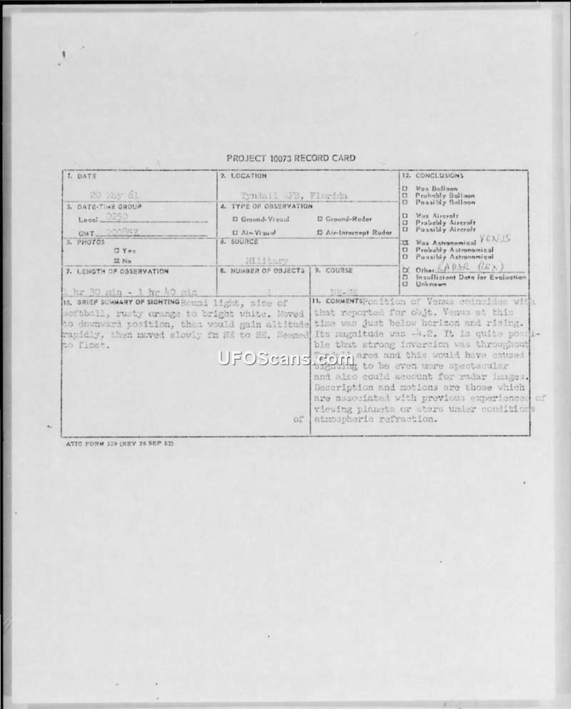 This document details a series of UFO sightings at Tyndall AFB in May 1961, including a significant event on May 20th involving visual and radar observations. The military investigation concluded the primary sighting was likely the planet Venus, exacerbated by atmospheric conditions.