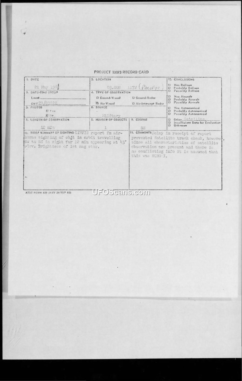 This document consists of a Project 10073 record card and an associated Department of the Air Force staff message regarding a CIRVIS (Communication Instructions for Reporting Vital Intelligence Sightings) report. On May 21, 1961, at 0922Z, an airborne observer reported sighting an object at coordinates 03.00N 117W in the Pacific region. The object was observed for 12 minutes, traveling from the northwest to the southeast at an altitude of 7,000 feet above the weather. The observer described the object as having the brightness of a first-magnitude star. The report was transmitted through military channels, including the Hawaii Air Defense Division, CINCPAC, and other regional commands. The official evaluation concluded that the sighting was likely the ECHO I satellite. The record card notes that a delay in the receipt of the report prevented an immediate satellite track check, but the characteristics of the observation were consistent with a satellite, leading to the final determination that the object was ECHO I.