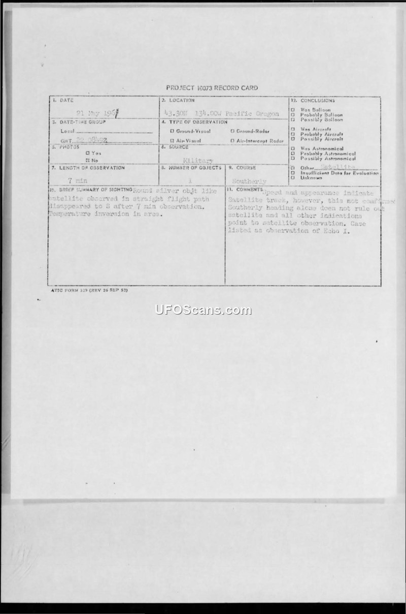 On May 22, 1961, at 0849Z, a sighting of an unidentified aerial object occurred over the Pacific Ocean at coordinates 43.30N 134.00W. The object was observed by Major Harold L. Cook and 1/LT Frank E. McCallister of the 963 AEW&C Squadron while aboard an RC-121 aircraft. The witnesses described the object as oval-shaped, silver in color, and resembling the 'head of a pin.' The object was observed for a duration of seven minutes, during which it maintained a straight flight path from north to south at an estimated altitude of 18,000 to 22,000 feet. The witnesses noted that the object moved at a very high rate of speed, making it too fast to observe through a sextant. Weather conditions in the area included scattered clouds on the northwest horizon and a temperature inversion. The official conclusion reached by the Air Force was that the object was likely a satellite, specifically Echo I, although the satellite track could not be definitively confirmed. The report notes that the seven-minute duration of the sighting made a preliminary analysis difficult for the intelligence officer of the 552 AEW&C Wing.