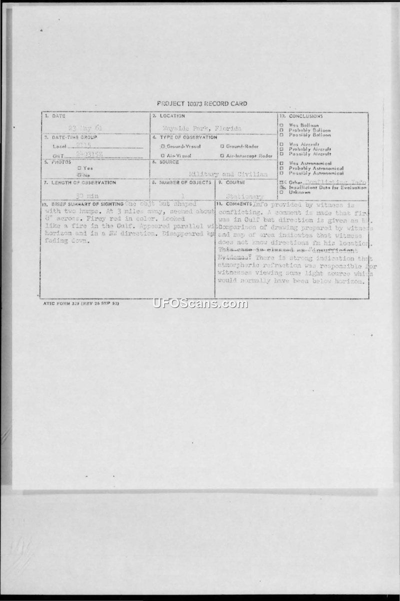 Report on Unidentified Flying Object (UFO) — Wayside Park, Florida, 23 May 1961