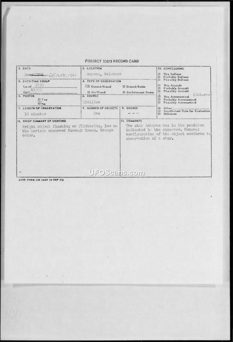 An 11-year-old witness reported an orange disc in Smyrna, Delaware, in May 1961. The U.S. Air Force concluded the object was the star Antares.