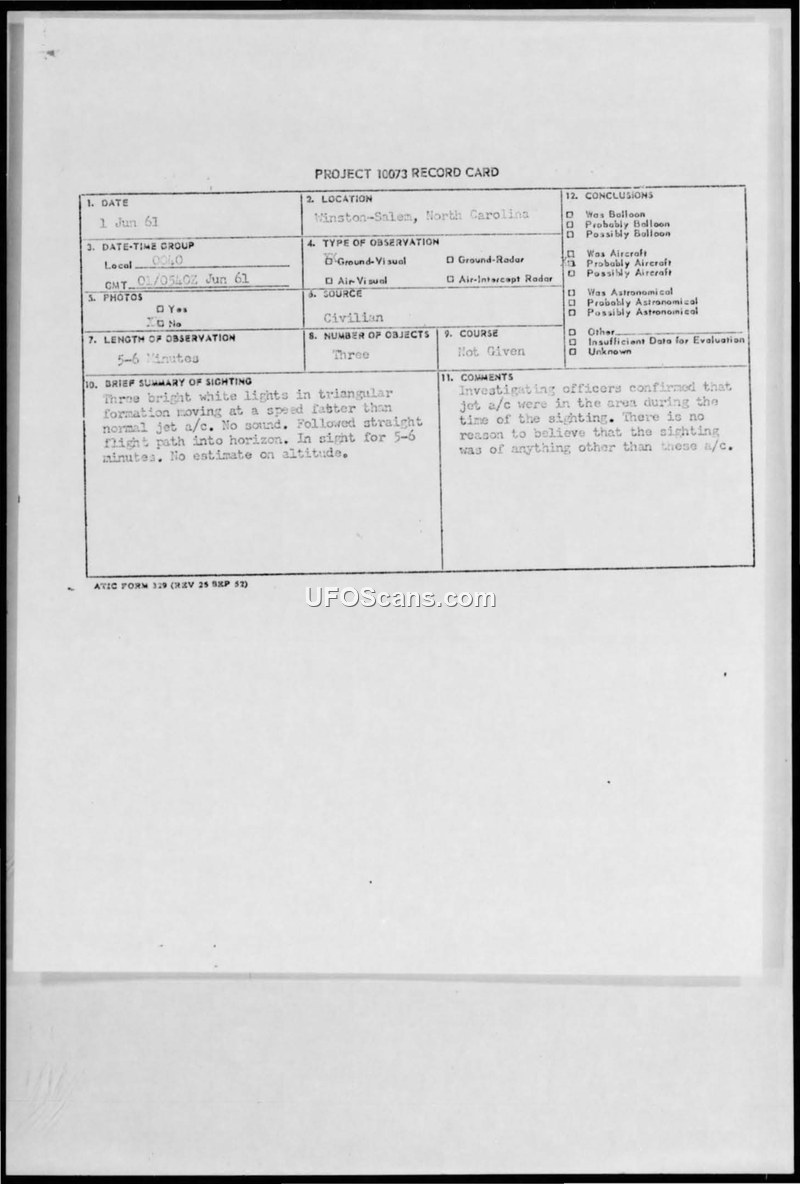 On June 1, 1961, at approximately 0040 local time, a civilian observer in Winston-Salem, North Carolina, reported a sighting of three bright white lights in a triangular formation. The observer, described as a 26-year-old unemployed individual, reported that the objects were moving at a speed faster than a normal jet aircraft and made no sound. The objects followed a straight flight path into the horizon, and the observation lasted between five and six minutes. The report was processed via a Project 10073 record card and a priority cable from the 792nd ACW Squadron at North Charleston AFS. Investigating officers noted that there were F-101 and B-66 aircraft from Shaw AFB operating in the area at the time of the sighting. While anomalous propagation was noted on the 'Paris Green' radar, the 'Bush Coral' radar reported negative results, which was attributed to the objects being in the immediate vicinity of the radar site and potentially lost in ground clutter. The official conclusion reached by the investigating officers was that the objects were likely the military aircraft operating in the area, and there was no reason to believe the sighting involved anything else.