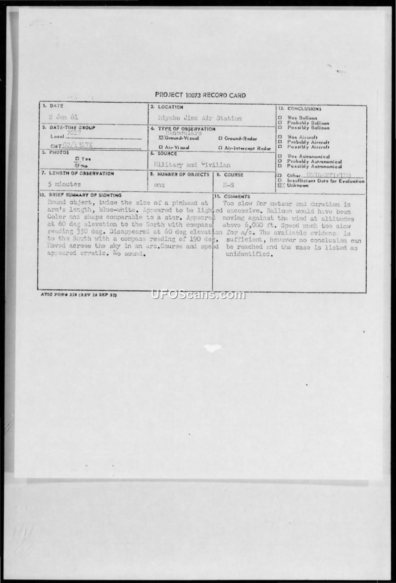 Project 10073 Record Card — Miyako Jima Air Station, 2 June 1961