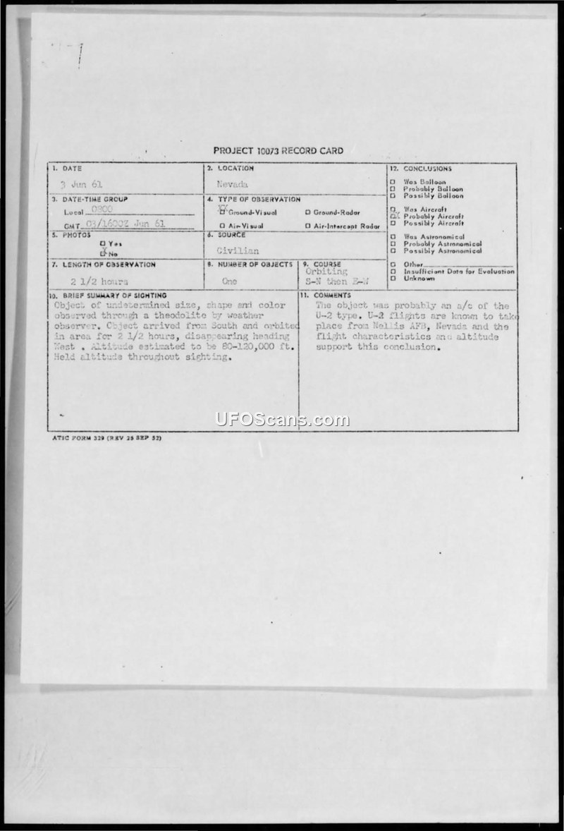 This document consists of a Project 10073 record card and an associated incoming Air Force staff message detailing a UFO sighting that occurred on June 3, 1961, near the Atomic Energy Commission (AEC) Mercury Test Site in Nevada. The object was first observed at approximately 1600 hours Zebra by a weatherman using a theodolite. The witness reported that the object arrived from the south, orbited the area for two and a half hours, and then turned 90 degrees to the west before disappearing at approximately 1830Z. The observer estimated the object's altitude to be between 80,000 and 120,000 feet. Despite attempts by operators at Nellis Air Force Base to track the object using binoculars, they were unable to obtain a fix before it departed. A T-33 aircraft was vectored to the area where the object was last seen, but the search yielded negative results. The report notes that there were no balloon releases in the area and that the Federal Aviation Administration (FAA) confirmed no scheduled flying activities could account for the sighting. However, the report concludes that the object was likely a U-2 aircraft, noting that U-2 flights were known to operate from Nellis Air Force Base and that the observed flight characteristics and altitude were consistent with such aircraft. Major Anthony J. Busalacchi, Director of Intelligence for the 4520th Combat Crew Training Wing, provided the originator's comments, noting that the characteristics of this sighting resembled a previous report from May 11, 1961. The document highlights the difficulties in identification due to the extreme altitude, the lack of electronic tracking, and the limitations of ground-based optical equipment.