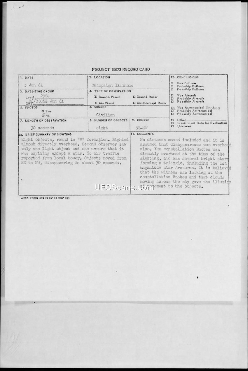 On June 5, 1961, at 0505Z, two observers in Champaign, Illinois, reported a sighting of eight round, bright white objects moving in a V-formation. The observers, who were lying on the roof of a home, initially believed they were seeing unidentified aerial phenomena. The objects were described as moving in a straight line from the southeast to the northwest, with the entire event lasting approximately 30 seconds. The witnesses noted that the objects appeared to be the size of a half-dollar when viewed from their position. Following the report, an investigation was conducted by an instructor from the Aircraft Maintenance Officer Course. The investigation included interviews with both witnesses. The investigating officer concluded that the objects were not aircraft, as Chicago Center confirmed there was no known air traffic in the area at the time. Instead, the investigator determined that the witnesses had likely observed the constellation Bootes, specifically the first-magnitude star Arcturus. The report suggests that the witnesses experienced an optical illusion; because they were looking straight up without a fixed reference point, the movement of clouds across the sky in a southeasterly direction created the false impression that the star was moving toward the northwest. The official record card for Project 10073 categorizes the event as an explained sighting, attributing the observation to astronomical phenomena.