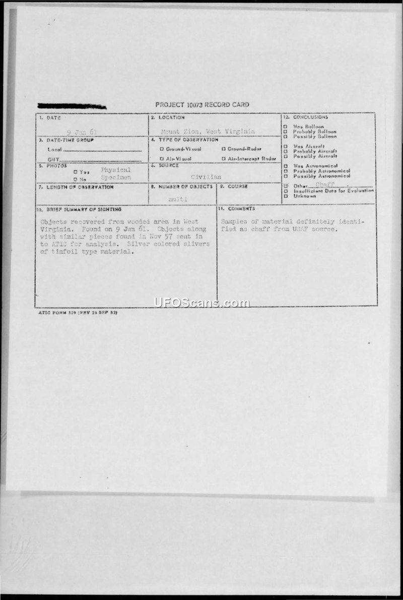 This document file contains a Project 10073 record card and associated correspondence regarding the recovery of metallic slivers in Mount Zion, West Virginia. A citizen reported finding piles of silver-colored, tinfoil-like slivers in a wooded area on June 9, 1961, noting that similar material had been found in the same area in November 1957. The witness sent samples of these materials to the Aerospace Technical Intelligence Center (ATIC) for analysis, seeking information on their origin and purpose. In a response dated June 23, 1961, Colonel Philip G. Evans of the USAF confirmed that the material was 'chaff,' a substance used by the Air Force to interfere with radar frequencies during training and testing. The correspondence explains that chaff is typically released in bundles from aircraft at high altitudes—approximately eight miles up—and is designed to fall slowly, which accounts for the material drifting into the witness's area and being found in small, neat piles. The official conclusion recorded on the project card is that the material was definitely identified as chaff from a USAF source.