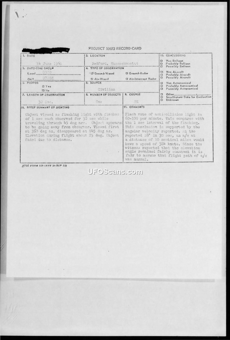 Project 10073 Record Card — Sighting of Unidentified Object, Bedford, Massachusetts, 14 June 1961