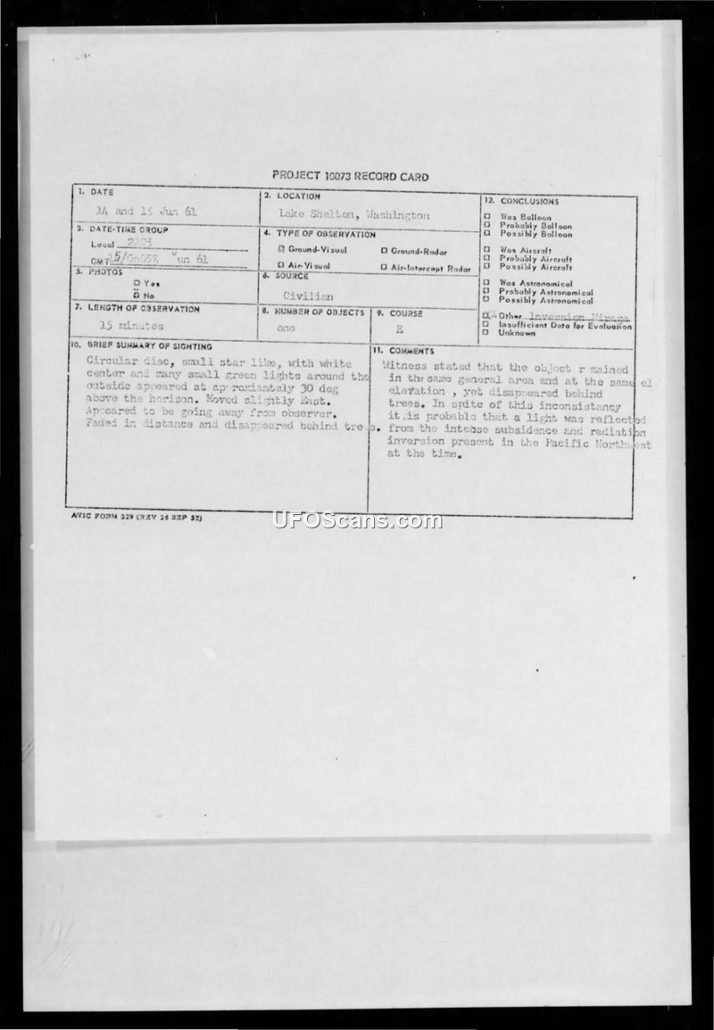 Project 10073 Record Card and UFOB Report — Lake Stevens, Washington, June 1961