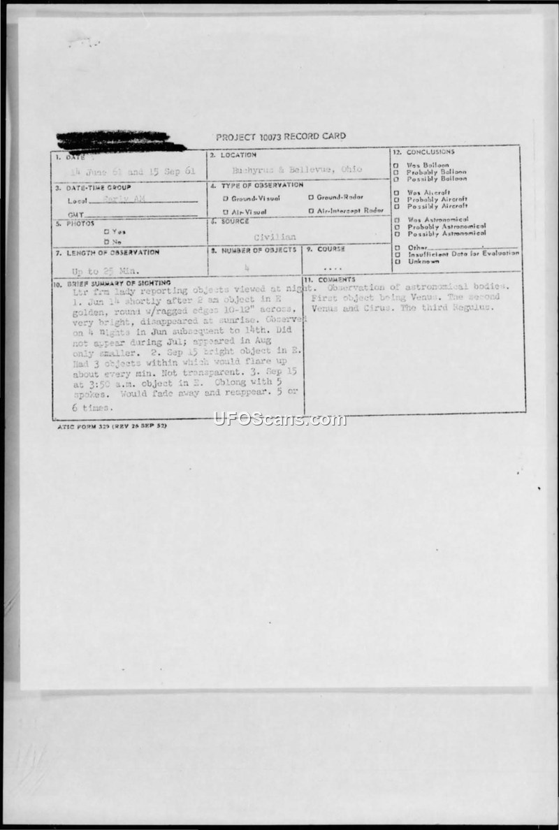 This document collection contains correspondence and record cards regarding a series of UFO sightings reported by a civilian woman in Bucyrus and Bellevue, Ohio, during 1960 and 1961. The witness submitted detailed letters to the Aerospace Technical Intelligence Center (ATIC) describing various objects observed in the eastern sky, including golden, round objects with ragged edges, silver oblong objects with spokes, and a large cigar-shaped or elliptical object. The witness expressed concern about these sightings, noting that they caused her to lose sleep and that she was seeking information on whether these were foreign or domestic objects. The Air Force, through the Foreign Technology Division (FTD) and Major William T. Coleman, Jr., evaluated these reports. Their official conclusion was that the sightings were misidentifications of astronomical bodies. Specifically, they attributed the observations to atmospheric refraction of the planet Venus, the star Sirius, and the star Regulus. One of the final objects reported was suspected by the Air Force to be the Soviet spacecraft Lunik III. The file also includes correspondence between Major Coleman and Richard Hall of the National Investigations Committee on Aerial Phenomena (NICAP), where the Air Force requested more details regarding a separate sighting over Blue Ridge Summit, Pennsylvania, on June 4, 1961, noting that they had no material on that specific event. The collection serves as a record of the Air Force's process for handling civilian UFO reports during the early 1960s, emphasizing the systematic categorization of such reports as astronomical phenomena or known objects.