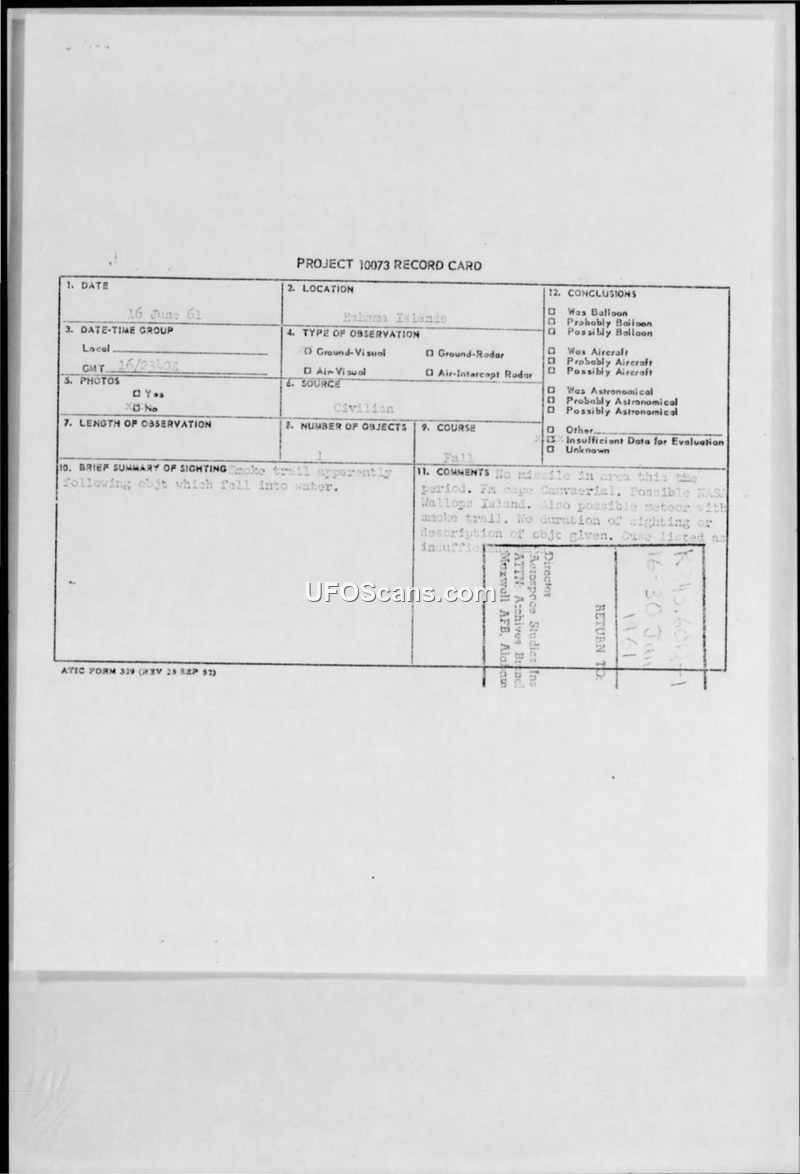Project 10073 Record Card — Bahamas Islands, 16 June 1961