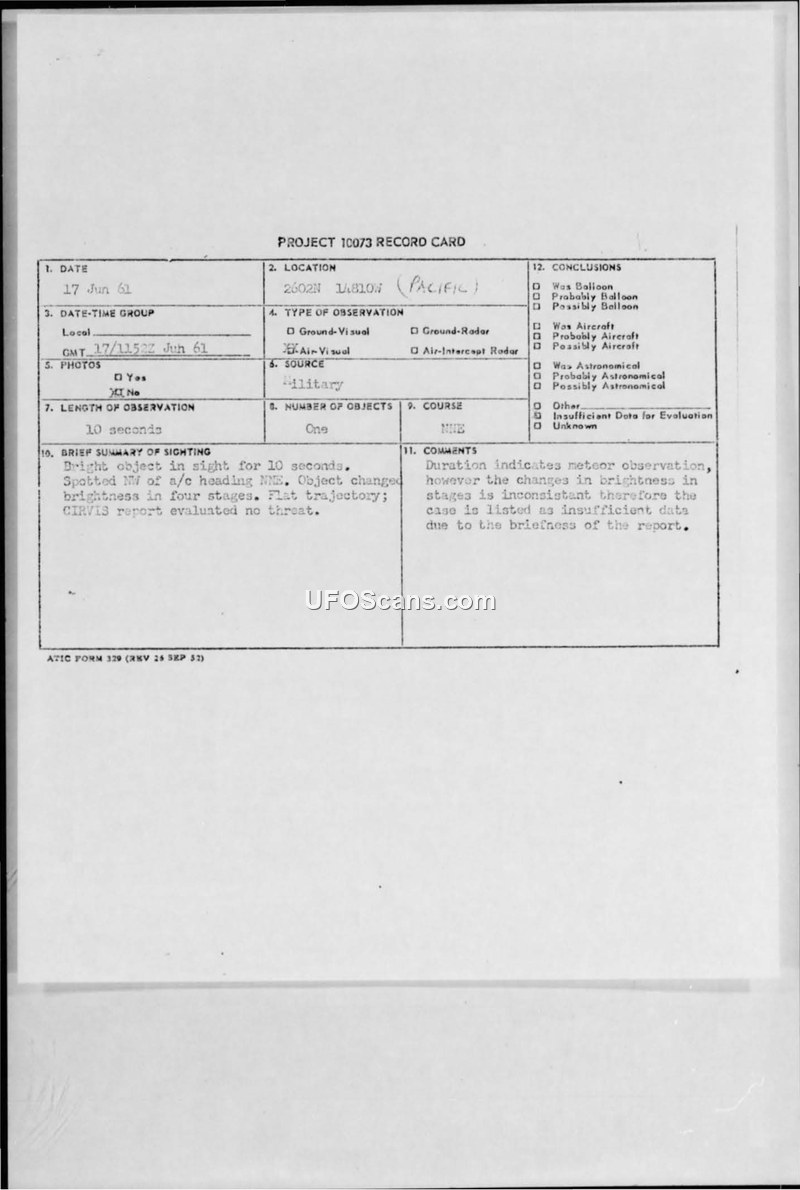 PROJECT 10073 RECORD CARD — 17 Jun 61