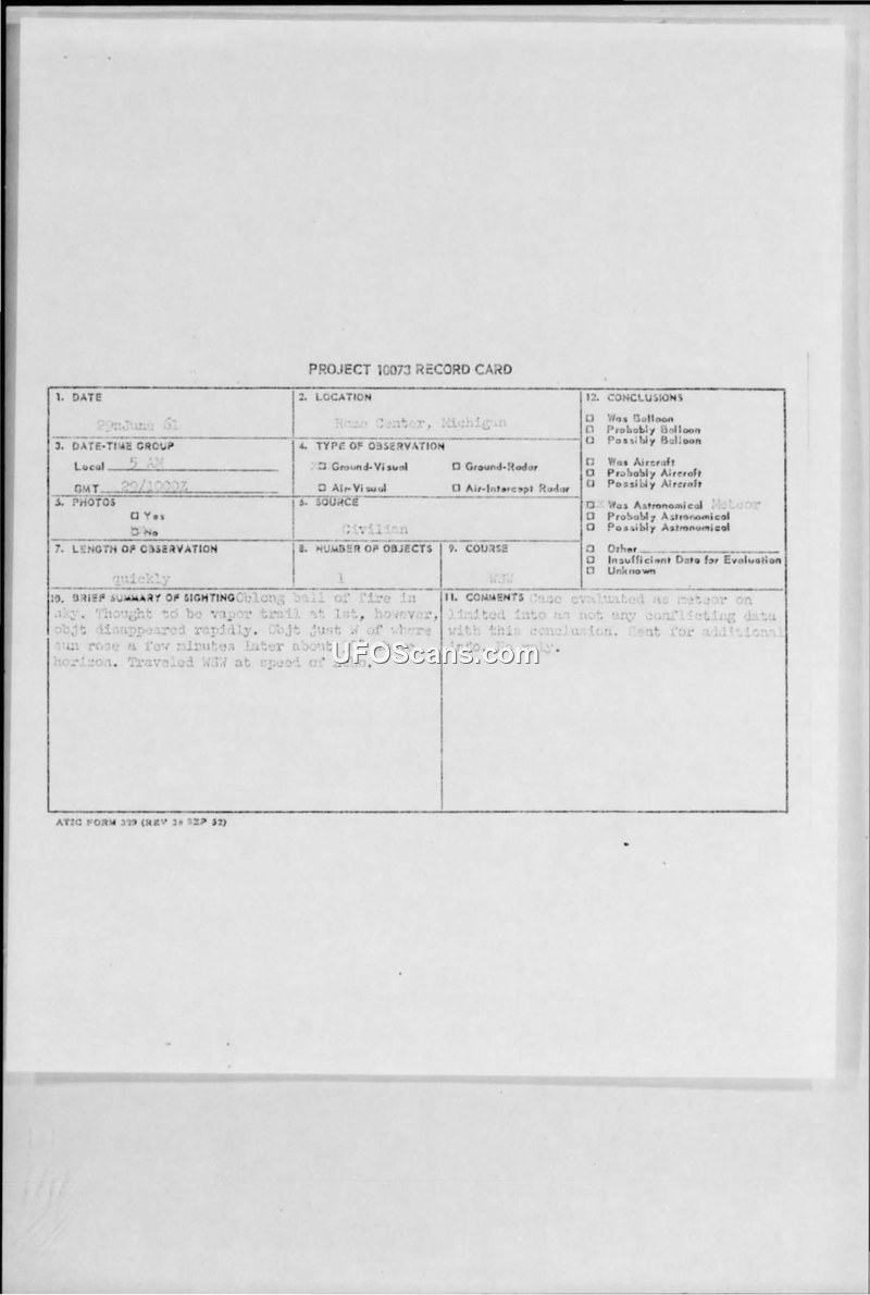 Project 10073 Record Card — Rane Center, Michigan, June 29, 1961
