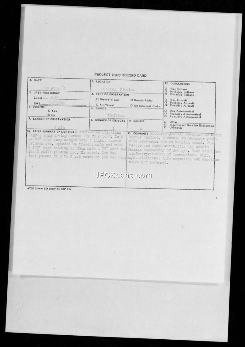 Project 10073 Record Card — Palatka, Florida, 29 June 1961