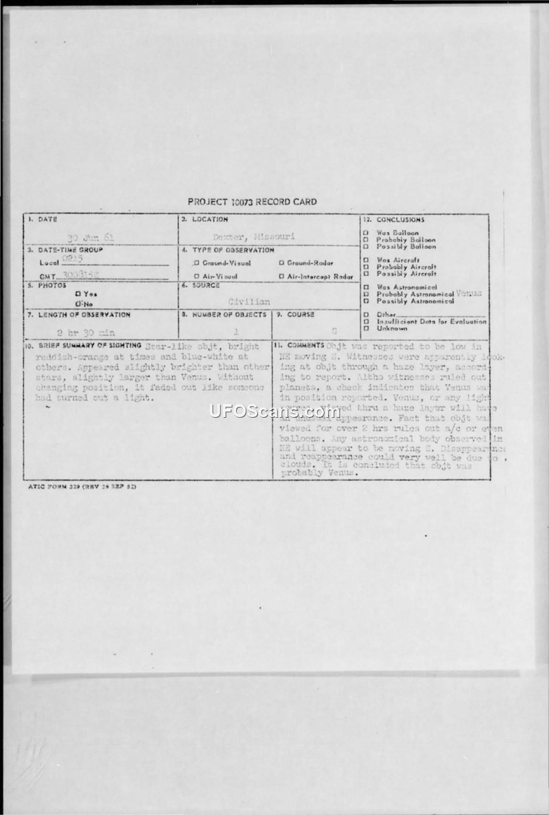 A civilian reported a star-like object in Dexter, Missouri, on June 30, 1961. The Air Force investigated the report and concluded the object was likely the planet Venus viewed through atmospheric haze.