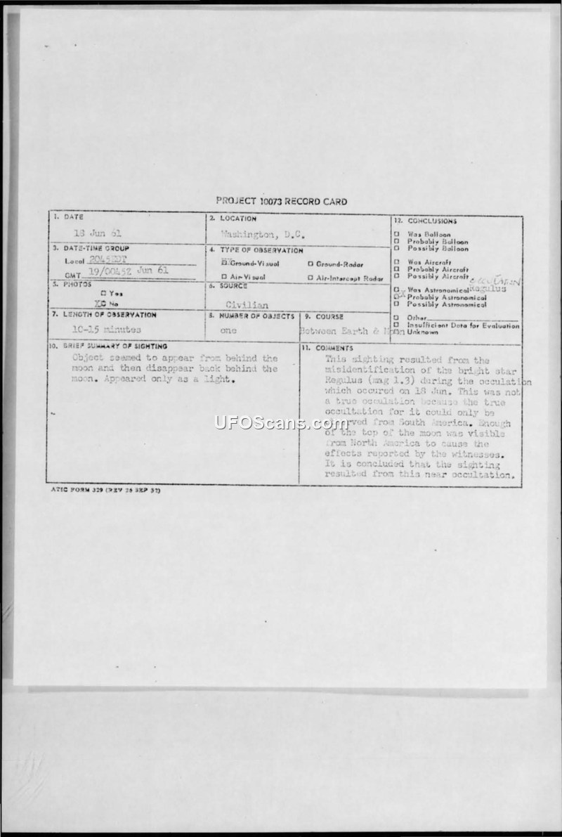 On the evening of June 18, 1961, a civilian witness in Washington, D.C., reported observing an unidentified aerial phenomenon. The witness, who was standing on a sidewalk, described seeing a single, incandescent white light that appeared to emerge from behind the moon and eventually disappear back behind it. The observation lasted approximately 10 to 15 minutes. The witness noted that the object appeared as a bright light, similar to a star or a large satellite like Echo I, and made no sound. The witness reported the incident to the Washington D.C. Star and Post Times Herald. The U.S. Air Force investigation, documented on a Project 10073 record card, concluded that the sighting was a misidentification of the star Regulus (magnitude 1.3). The report explains that while a true occultation of the star was only visible from South America, the geometry of the event as viewed from North America created the appearance of the star moving behind the moon, leading to the reported observation. The witness provided a detailed questionnaire, including sketches of the object's path relative to the moon, and maintained that the object was a point source of light with no edges.