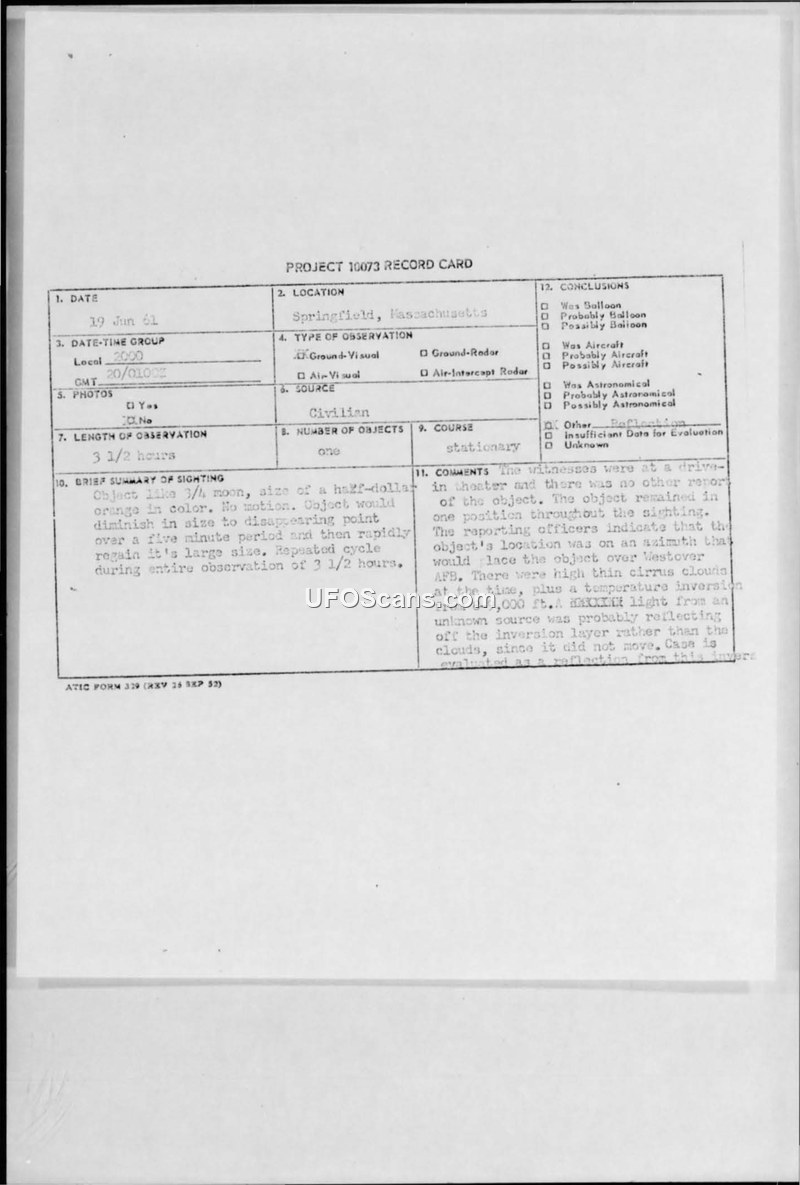 This document consists of a Project 10073 Record Card and associated military correspondence regarding an unidentified aerial phenomenon sighting in Springfield, Massachusetts, on 19 June 1961. The primary witness, identified as a member of the MOSIC Combat Intelligence unit at the 509th Bombardment Wing, Westover AFB, observed a stationary object for approximately three and a half hours while at a drive-in theater. The witness described the object as resembling a three-quarter moon, orange in color, and roughly the size of a half-dollar. The object exhibited a cyclical behavior, diminishing in size until it disappeared over a five-minute period, only to rapidly regain its original size. The observation occurred between 2100 local time and 0024 local time. Military investigators from the 57th Air Division and ATIC evaluated the report. Meteorological data indicated the presence of high, thin cirrus clouds and a temperature inversion between 8,000 and 9,000 feet. The official conclusion reached by the Air Force was that the object was not a physical craft but rather a reflection of an unknown light source off the temperature inversion layer. The report notes that the object remained stationary throughout the duration of the sighting, which supported the reflection hypothesis. Correspondence between Westover AFB and ATIC confirms the timeline of the event and clarifies that the sighting was continuous. A final note suggests that the witness may have been observing a ceiling light distorted by atmospheric conditions.