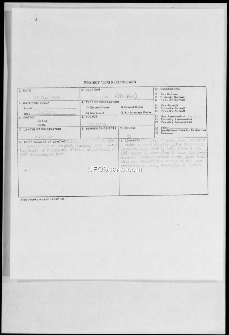 A United Airlines flight crew reported a brightly burning object over the Pacific on 20 June 1961. The Air Force evaluated the sighting as a bolide associated with known space debris.