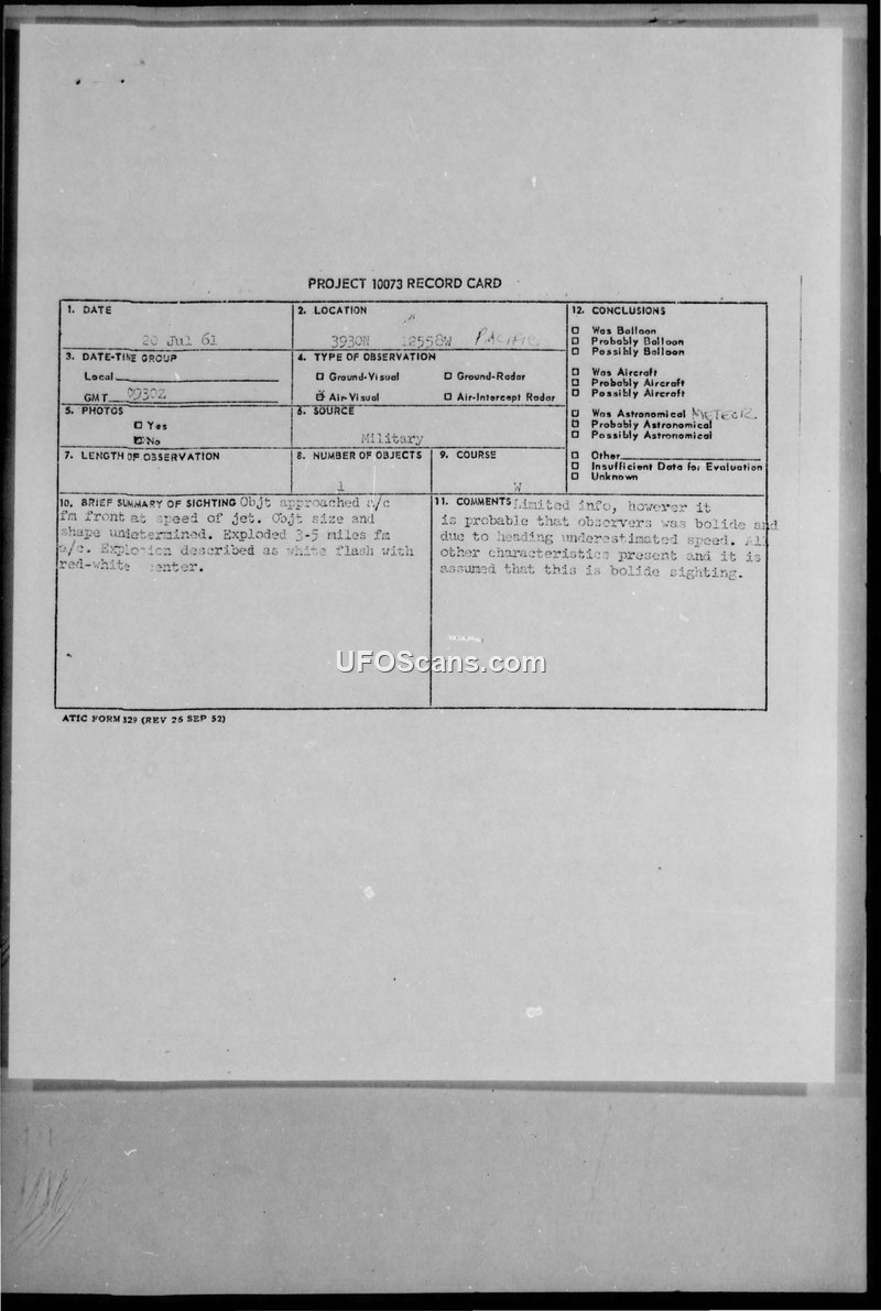 On July 20, 1961, at 0930Z, the crew of an aircraft identified as Ethan-26 observed an unidentified object while flying at 7,000 feet. The object was traveling on a heading of 090 degrees at an altitude slightly below the observers. The aircraft commander, Captain Lowell Call, and the pilot, Clyde T. Dennis, reported that the object approached them from the front at a closure speed they described as faster than a piston-engine aircraft but consistent with a jet. Due to darkness, the crew could not determine the object's specific outline, though they initially assumed it was a jet aircraft. The object subsequently exploded at a distance of three to five miles off the left wing of the Ethan-26 aircraft. The explosion was described as a white flash with a reddish-white center. The object was not tracked by the radar operator on board. Following the incident, a CIRVIS (Communication Instructions for Reporting Vital Intelligence Sightings) report was submitted. The official conclusion recorded on the Project 10073 record card suggests that the object was likely a bolide, or meteor, and that the observers had underestimated its speed due to the heading. The report notes that all other characteristics were consistent with this assessment, and it was officially categorized as a bolide sighting.