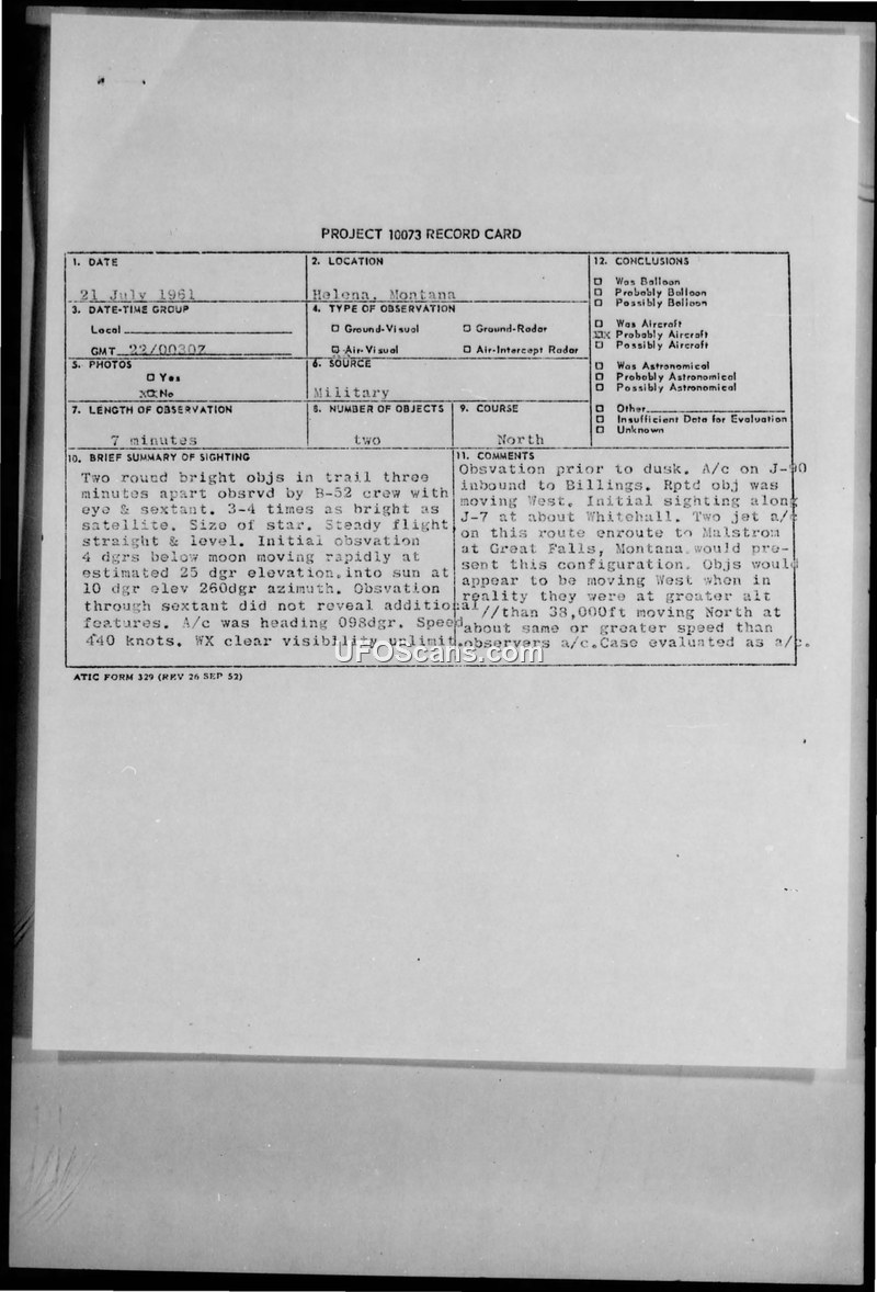 Project 10073 Record Card — Helena, Montana, 21 July 1961
