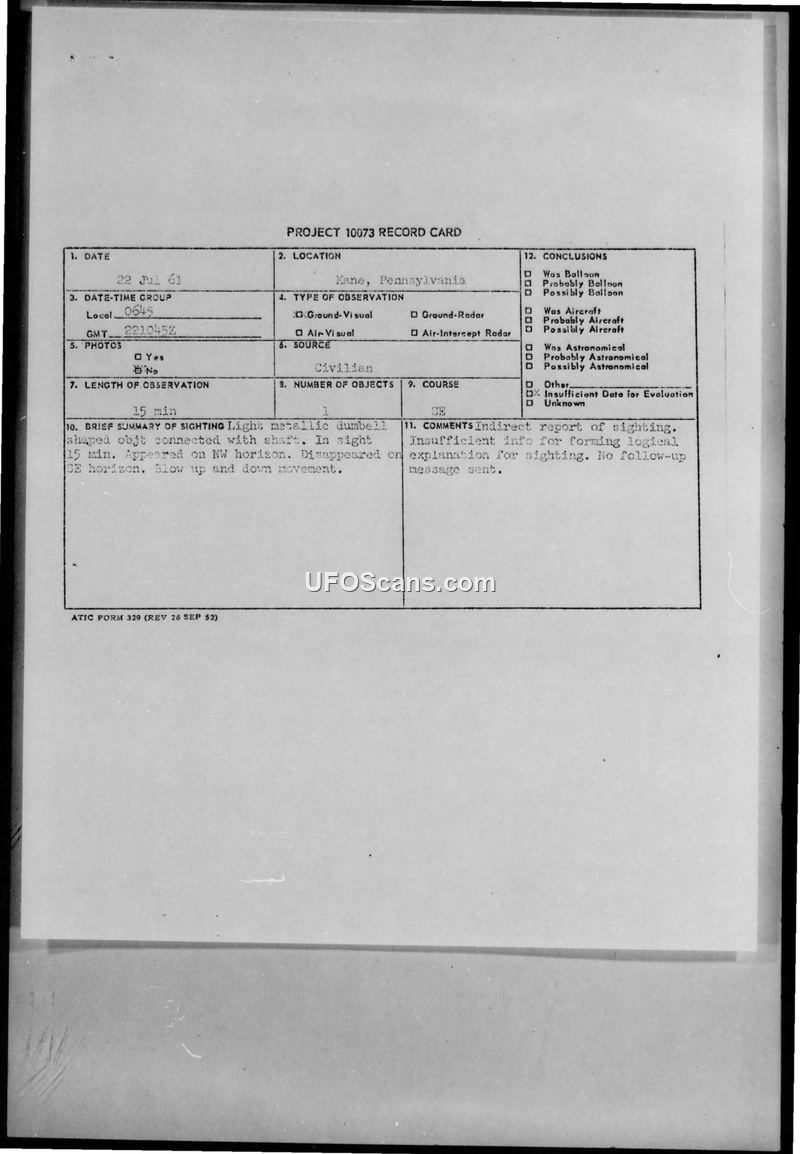 A report of a dumbbell-shaped object seen in Kane, PA, on July 22, 1961. The Air Force classified the incident as having insufficient data for a logical explanation.