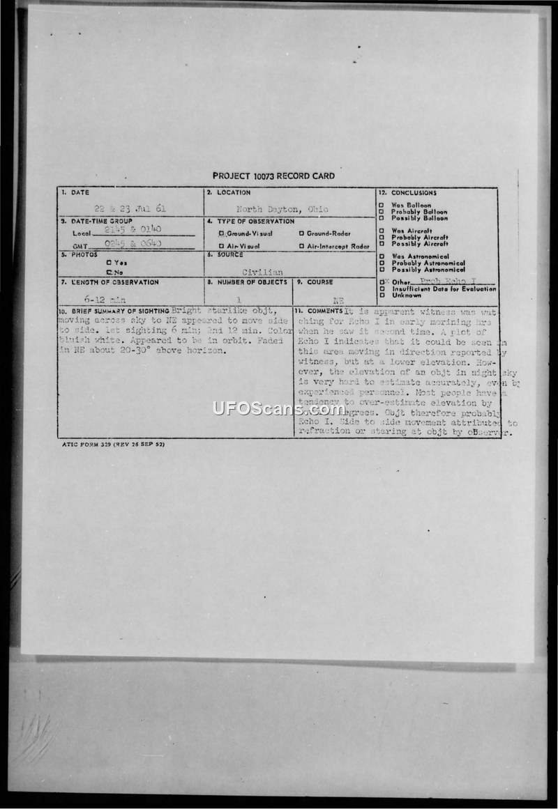 This document is a Project 10073 record card and accompanying U.S. Air Force Technical Information Sheet detailing a sighting reported by a 30-year-old Naval Reserve officer in Huber Heights, Dayton, Ohio. The witness reported observing a bright, bluish-white, star-like object on the nights of July 22 and 23, 1961. The object moved from the southwest to the northeast. The witness described the object's behavior as erratic, noting side-to-side movements and fluctuations in speed, which he initially thought might be a satellite or a Sputnik booster. The sighting lasted between 6 and 12 minutes, and the object eventually faded from view at an elevation of approximately 20 to 30 degrees above the horizon. The witness, who was outdoors at his home, reported the incident to Wright-Patterson Air Force Base (WPAFB) at 0150 hours. The official evaluation, conducted by an FTD duty officer, concluded that the object was the Echo I satellite. The report notes that a plot of the Echo I satellite's trajectory confirmed it could have been visible in the area at the time, albeit at a lower elevation than the witness estimated. The investigator suggested that the witness's perception of erratic movement and speed changes was likely due to atmospheric refraction or the physiological effects of staring at a bright object in the night sky, noting that individuals often overestimate elevation.
