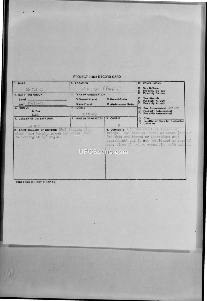Project 10073 Record Card — 26 July 1961