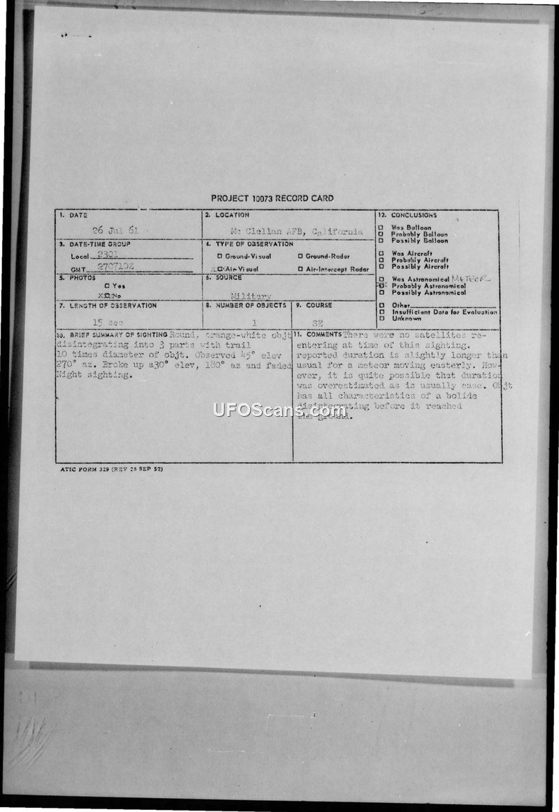 Project 10073 Record Card — Sighting at McClellan AFB, California, 26 July 1961