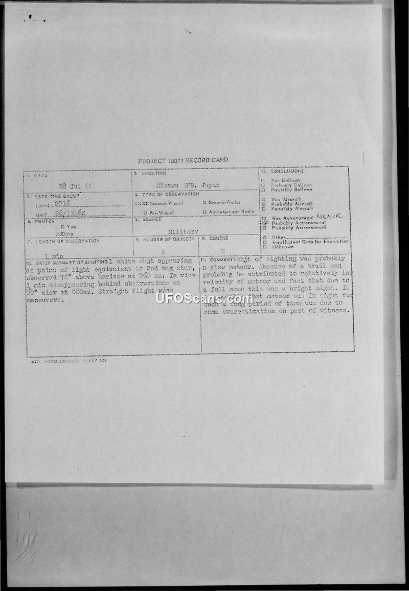 Project 10073 Record Card — Misawa AB, Japan, 28 July 1961