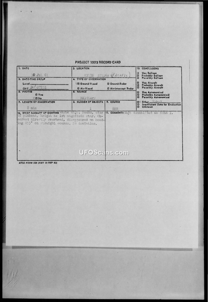 On July 30, 1961, at 0721Z, personnel aboard the USS Lansing observed an unidentified aerial object while located at 28 13N 121 16W in the Pacific. The sighting was reported by ENS C. W. McKenney and witnessed by LCDR D. J. Krejacared, the Commanding Officer, and LT T. H. Wood, the Executive Officer. The object was described as round, white, and the size of a pinhead, with a brightness comparable to a first-magnitude star. It possessed no tail and was observed for a duration of eight minutes using binoculars. The object was tracked moving from the west-southwest to the east-northeast, passing directly overhead before disappearing into clouds. Weather conditions at the time were reported as clear to partly cloudy with a ceiling of 1800 feet and visibility of seven miles. The incident was formally documented via a Project 10073 record card and a subsequent staff message from the Hawaii Air Defense Division at Kunia Annex. Following the report, the object was officially identified as the Echo 1 satellite.