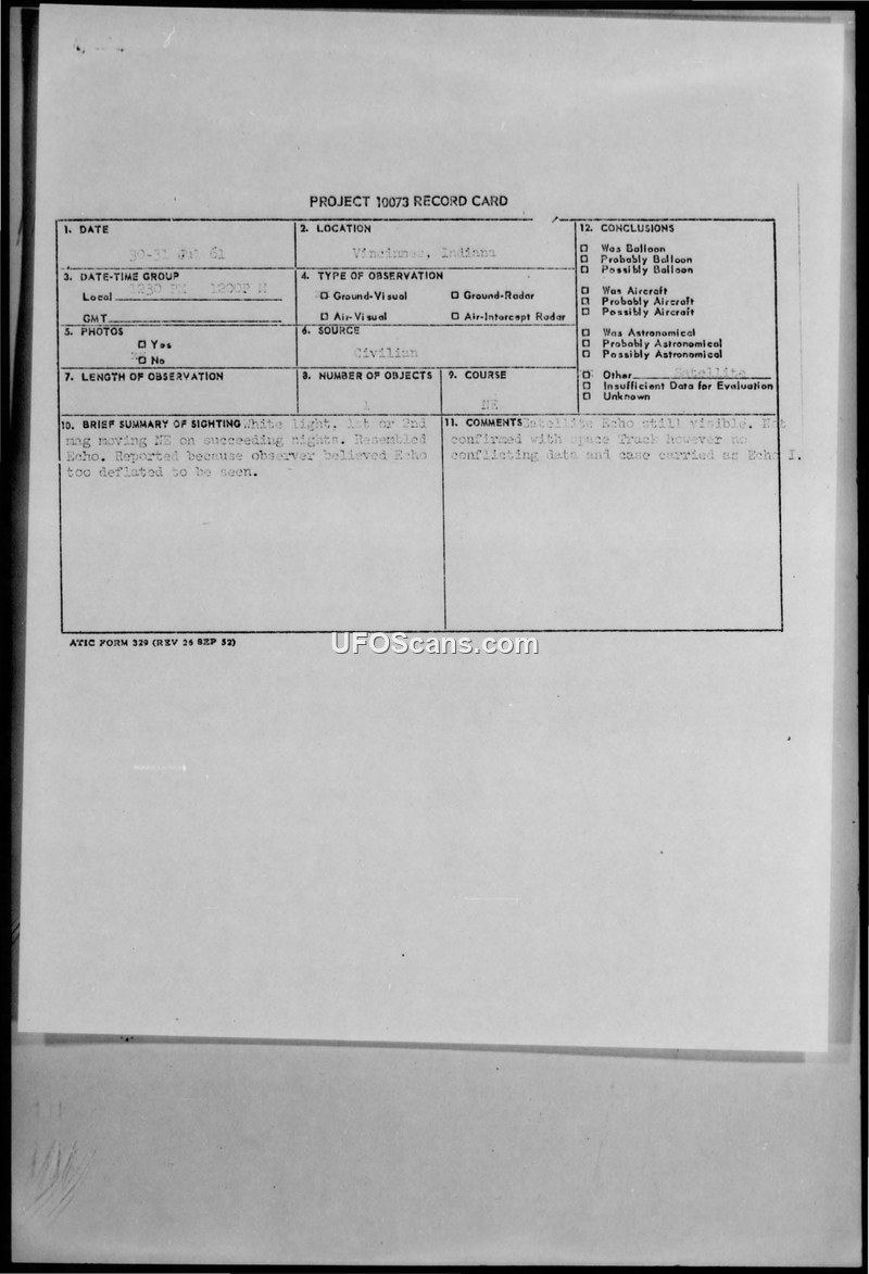 This document consists of a Project 10073 record card and associated correspondence regarding a sighting reported in Vincennes, Indiana. On the nights of July 30 and 31, 1961, a civilian observer reported seeing a white light of first or second magnitude moving from the southwest to the northeast. The observer noted that the light resembled the Echo satellite but questioned if it could be the satellite, as they believed the Echo was too deflated to be visible. The observer's inquiry was initially directed to the National Aeronautics and Space Administration (NASA) and subsequently referred to the United States Air Force. Major William T. Coleman, Jr., serving as the UFO Project Officer for the Air Force, responded to the observer on October 23, 1961. Major Coleman confirmed that the Echo satellite was indeed misshapen from its original configuration, but clarified that this deformation had not significantly impacted its reflectivity, allowing it to remain visible. The record card summarizes the incident, noting that the sighting was confirmed as the Echo satellite, despite initial conflicting data, and the case was closed accordingly.