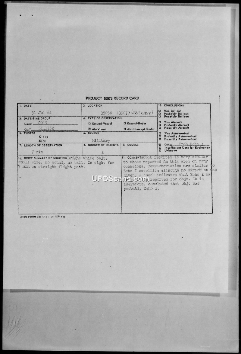 A 1961 sighting of a bright white object over Japan was investigated by the 3rd Bomb Wing. Intelligence officers concluded the object was likely the Echo I satellite based on its high altitude, straight trajectory, and characteristic dimming.