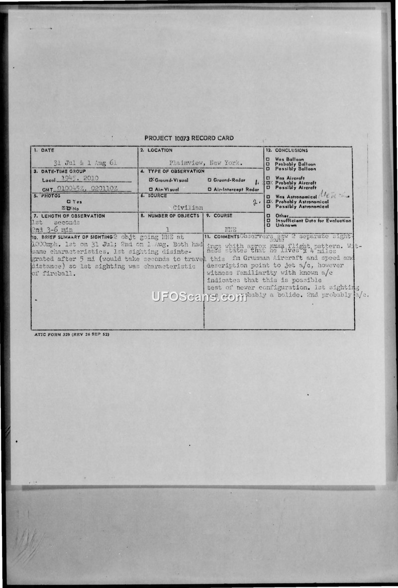 A 12-year-old witness in Plainview, New York, reported two sightings of a cylindrical object in July and August 1961. The Air Force evaluated the sightings as a bolide and an aircraft, respectively.