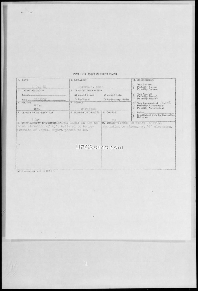 This document contains a series of records and reports regarding UFO sightings in Columbus, Ohio, during July 1961. The primary records consist of Project 10073 Record Cards and a summary report from the Aerospace Technical Intelligence Center (ATIC) dated 3 July 1961. The first incident, reported on 1 July 1961, involved a local resident who observed a bright light in the southwest sky at an elevation of approximately 45 degrees. The report was initially handled by the 376th Command Post at Lockbourne AFB and subsequently referred to ATIC. An investigation concluded that the object was likely the planet Venus, as confirmed by an almanac. A second incident, documented on a Project 10073 Record Card, occurred on 29 July 1961. A civilian witness reported an object in sight for 1.5 hours with a movement from southeast to southwest. The investigator noted that the witness was 'so belligerent' that they could provide very little useful information. A subsequent check indicated that the planet Jupiter was in the reported position, leading to the conclusion that the sighting was astronomical in nature. The document also includes a U.S. Air Force Technical Information Sheet completed by the witness of the 29 July event, who identified himself as a retired Navy veteran with a son serving as an Air Force Lieutenant in Alaska. The witness's testimony on the form is largely illegible and contains frustrated remarks regarding his experience with military personnel. The ATIC summary also notes other reports received by the Command Post, including a report from a Florida resident on 2 July 1961, which was deemed similar to the Dayton resident's report, and a report from a local resident on 3 July 1961 that was dismissed by the duty officer after consultation with a Sergeant.