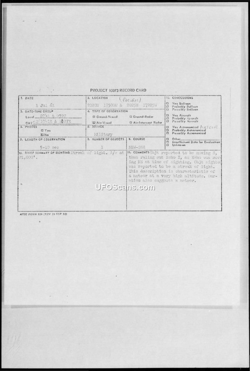 A 1961 military report documents a sighting of a bright streak of light in the Pacific. The object was evaluated by ATIC and officially identified as a meteor.